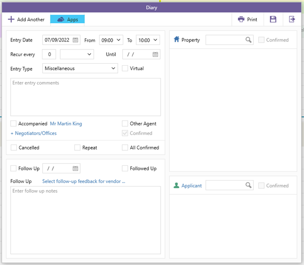 Opens the diary screen to provide a calendar view of appointments for the given date range. The dates don’t need to be set, but if you set one, you need to set both. If you don’t set a date range then the current default dates for the negotiator will be used.